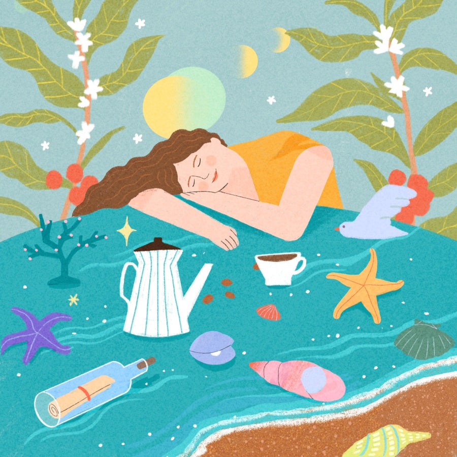 Sweet and soft scent of cafe latte in the morning at seaside.